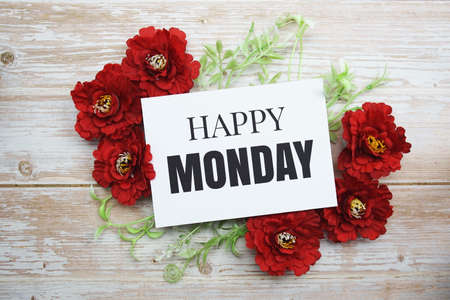 Motivational and inspirational quote on yellow note with flowers on wooden background - Happy monday, start each day with a positive thought.