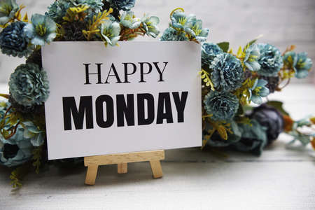 Happy Monday text on wooden easel standing on white brick wall and wooden background
