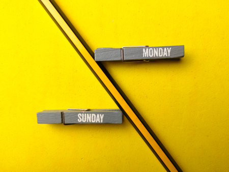 Pencil and wooden clips with the word MONDAY SUNDAY on a yellow background