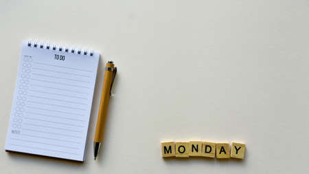 Notepad with pen and wooden word Monday on a beige paper background. Top view. Close-up. Flat lay.