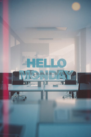 Bright office environment with empty workstations ready for the week ahead. The words Hello Monday are displayed in bold, welcoming staff to a fresh start.