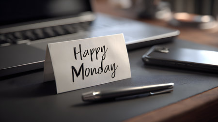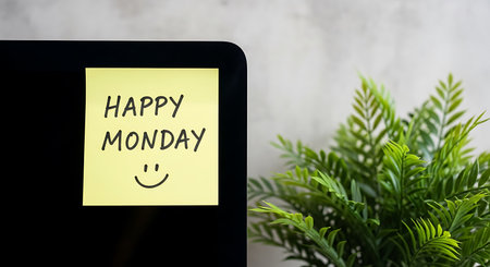 Yellow sticky note with Happy Monday and a smiley face on a computer monitor. Clear details and v...