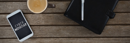 Mobile phone, coffee, pen and organizer on wooden plank against title for celebration of cyber monday
