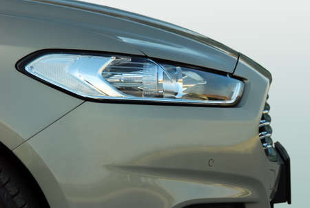 Close up of modern sedan headlamp. Front view shot from side of vehicle. Car headlight background.