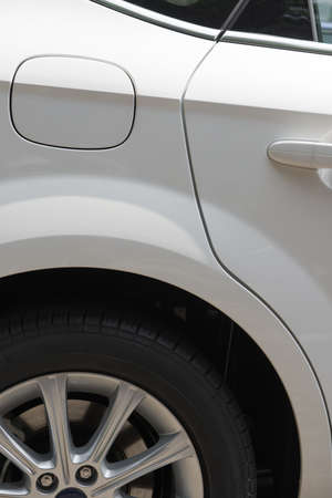 The front of the sports car. Wheel of a sports car on the background of a blurred sidewalk in a trendy metropolis area. Wheel close up.