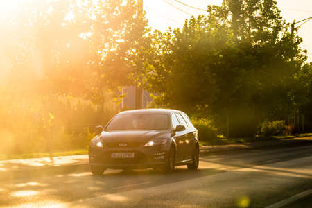SUV car driving fast on intercity road at sunset. Highway traffic in evening