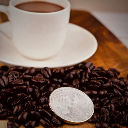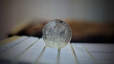 Digital currency physical metal silver monero coin. Cryptocurrency coffee concept.