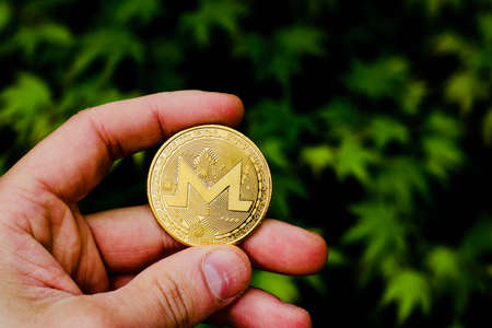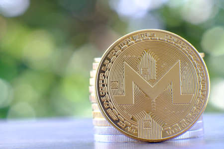 Digital currency physical metal monero coin. Cryptocurrency outdoor concept.
