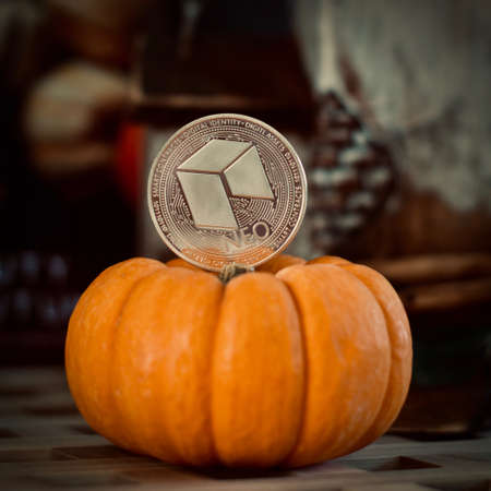 Digital currency physical silver metal neo coin. Orange halloween concept.