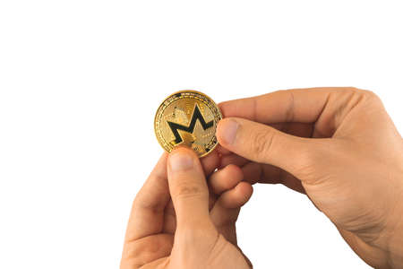 Man holds Monero coin in hands isolated on white background, cryptocurrency