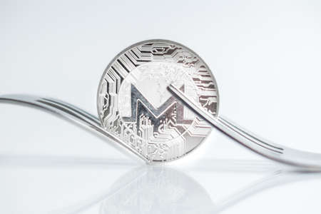 Monero cryptocurreny coin placed between forks with reflection, hard fork