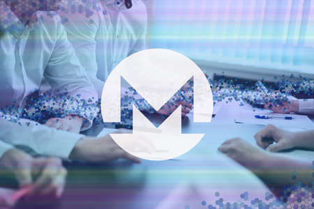 Monero, XMR cryptocurrency sign. The concept of business, cryptocurrency and finance - a team of businessmen are sitting in an office at a table.