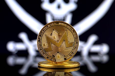 Physical version of Monero (XMR), new virtual money and Pirate Flag. Risk, safety and security. Studio shot.