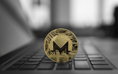 Silver Monero coin on a laptop keyboard. Exchange, bussiness, commercial. Profit from mining crypt currencies. Miner with ethereum coin.