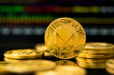 Gold Monero coin with a graph chart. Trading on the cryptocurrency exchange. Cryptocurrency Stock Market Concept. Virtual money concept. Mining or blockchain technology.