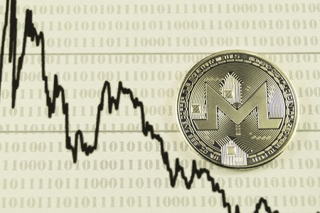 Cryptocurrency coin - silver Monero on black and white binary 1 and 0 background