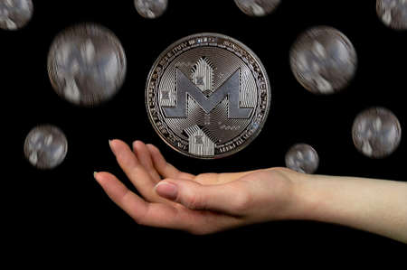 Monero coin and a man's hand on a black background. A symbol of technology and a new means of currency settlement