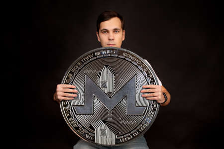 A man holds a monero coin in his hands as a symbol of technology. Image on black background