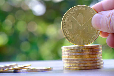 golden Monero (XMR) cryptocurrency coin stack, Crypto is Digital Money within the blockchain network, is exchanged using technology and online internet exchange. Financial concept