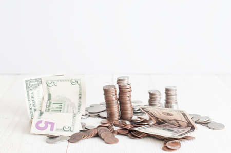 Piles of american cents and 5, 1 dollars banknotes on white