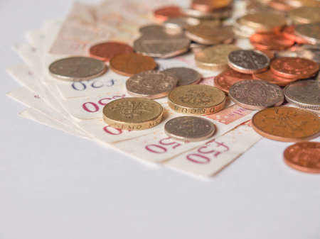 Moscow, Russia, February 2020: A pile of ten, twenty and fifty pound notes.