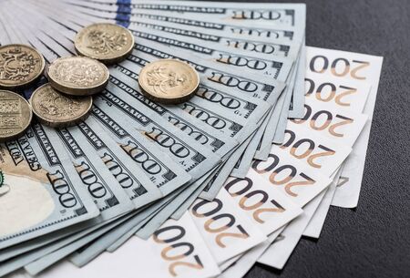 Cash banknotes dollars and euros are mixed up, a close-up shot.