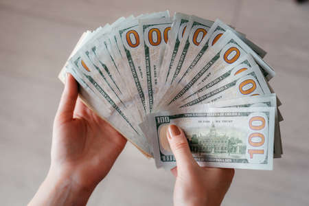 Business Woman Displaying a Spread of Cash US dollars. Close-up. Income and Business concept. Venality, bribe, corruption concept. Hand giving money. Millennial candid authentic female hands counting money usd. Business budget of wealth and prosperity finance