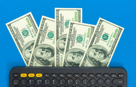 Keyboard and dollar bills. Freelance concept, concept of work at home, making money, workspace top view, flat lay design, copy space