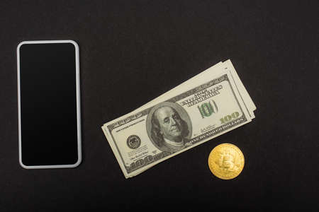 Dollars and smartphone. Denominations of 100 dollars are on a black background on them, next to them is a smartphone with a white screen. Top view and angle. Macro smartphone and dollars