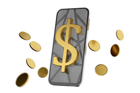 Golden dollar symbol on the phone screen, flying coins. Concept for online banking, mobile wallet. 3d render.