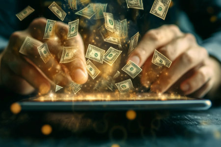 a businessman holding a cell phone with a lot of bills gushed out Represents investment ideas to make money from investments via mobile phone.