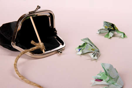 Three toads from one hundred euro banknotes catch with purse, close up
