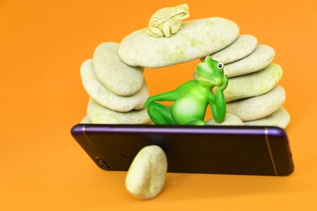 Close-up - frogs on the stones watching news on a smartphone.
