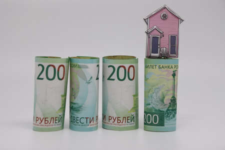 Red house on a stack of money. The concept of buying or selling real estate. Copy space for text.