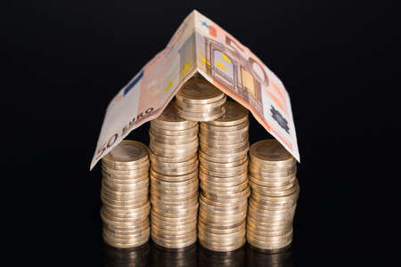 Imitation of a house made of coins with a banknote instead of a roo on dark background. Money concept. Closeup. Concept saving money for a home. Success, wealth and poverty, poorness concept