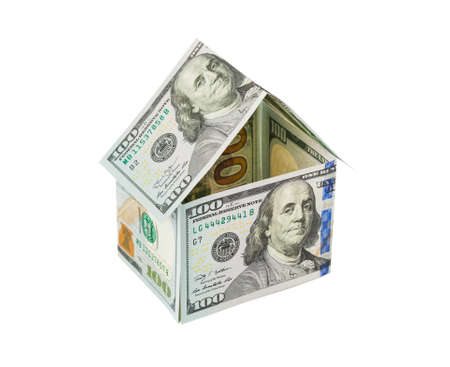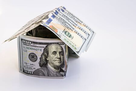 US dollar banknotes on display in the shape of a house on the white background, saving money for the house, copy space