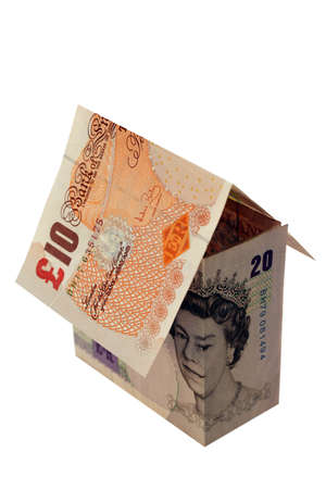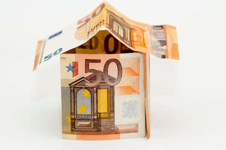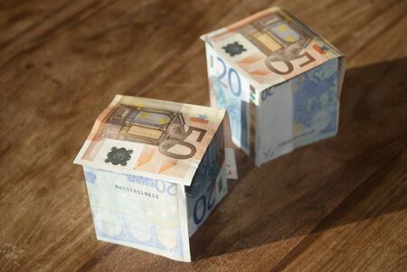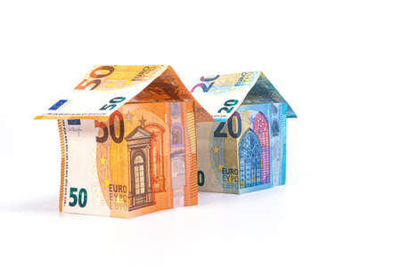 abstract houses from 50 and 20 euro banknotes isolated on a white background, home loan concept