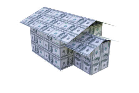 3d rendering. House from dollars bill packs banknote heaps, Investment property, real estate concept.