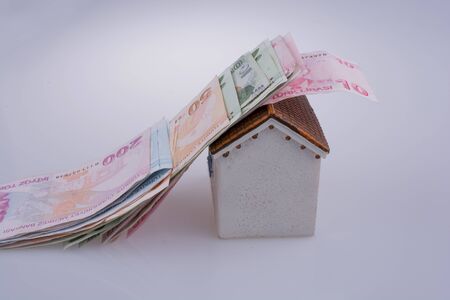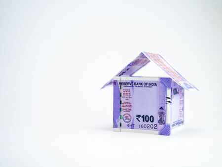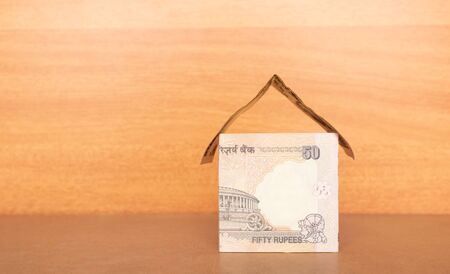 House made from the Indian currency with copy space, Concept of constructing house with Money