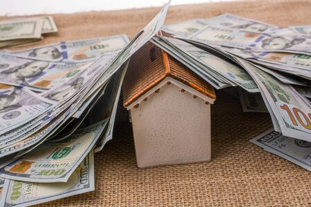 House and american dollars. Home buying or selling. Building on credit housing or renting an apartment. Miniature Home for family with Hundred Dollar Bills. Real Estate Investing and Housing Market