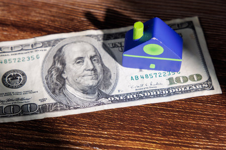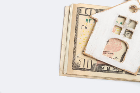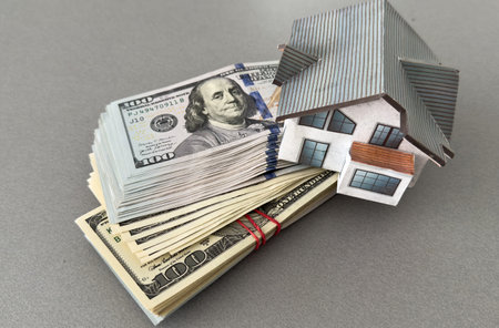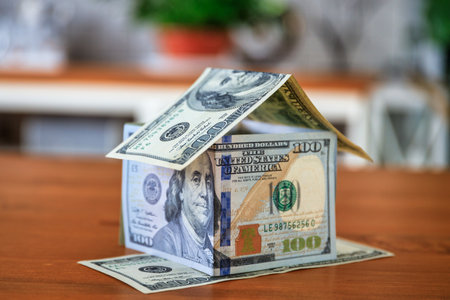 house property mortgage with cash money dollar bill on table concept of business finance, saving for buy home, investment loan, american currency, sale estate, bank payment, sell-rent real estate