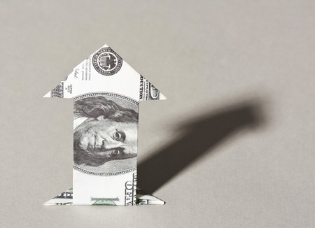 House figure with cash dollar banknotes, as symbol of investment in property to get profit. Insurance of property to protect.
