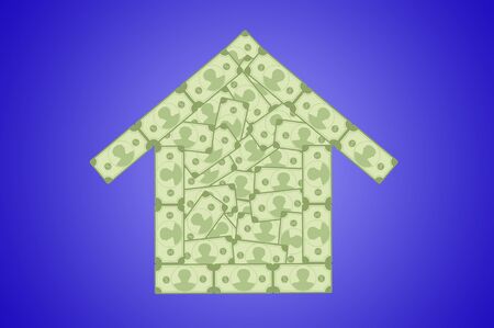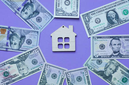 Dollar bills and a figurine of a house on a colored background. mortgage