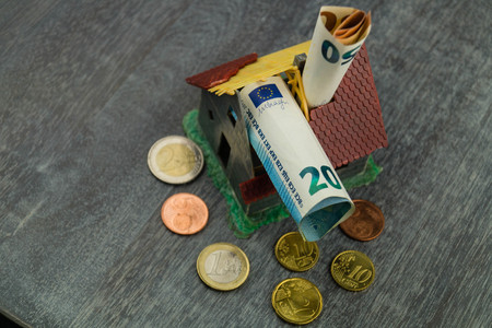 Money in international currency, including euro, dollar, a coin on which there is a toy house. The concept of mortgages, investments, loans, debts, housing purchases: apartments or houses