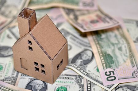 paper house model on background of US dollars banknotes. Housing market, purchase or rental of real estate