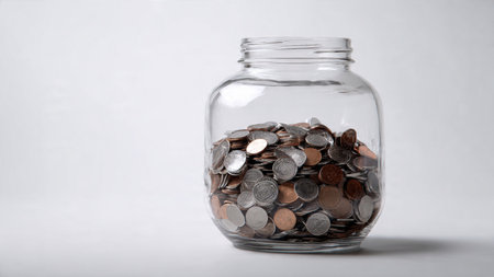 Clean economic concept showing a jar filled with coins, symbolizing savings and financial stability.