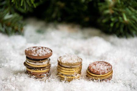 A golden pyramid of coins covered with snow against a background of green spruce branches. Success concept. Savings concept. Wealth concept in the new year