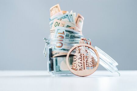 A hundred-dollar bill collapsed with a straw is on the branches of the New Year's spruce. Concept How much does Christmas cost or a gift for a New Year's holiday. Copy space.