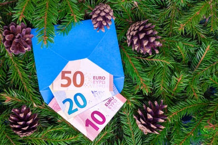 Euro money. 10, 20 and 50 banknote in a blue envelope against the background of Christmas tree branches. Concepts of expensive gifts for the New Year.