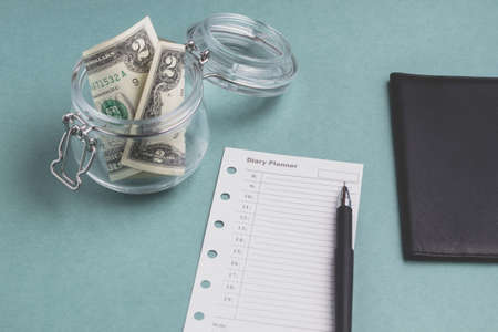 Two dollars in the jar and diary planner on a green background. Savings money or planning concept